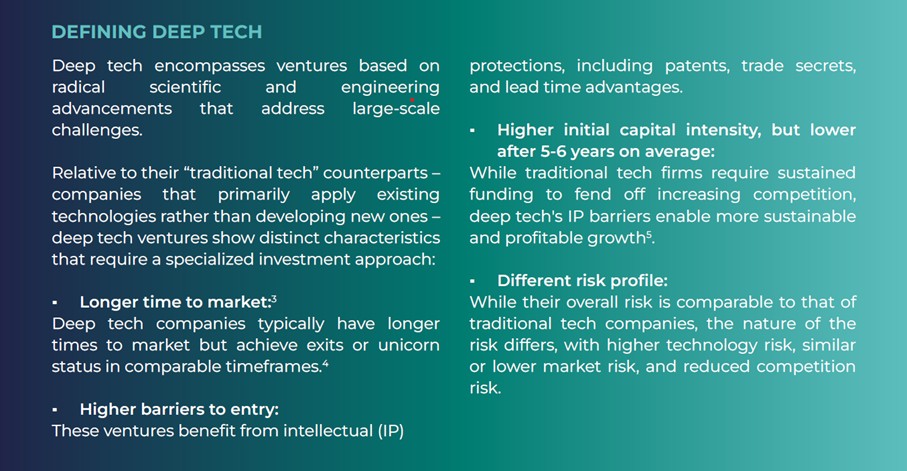 Deep tech encompasses ventures based on radical scientific and engineering advancements that address large-scale challenges.