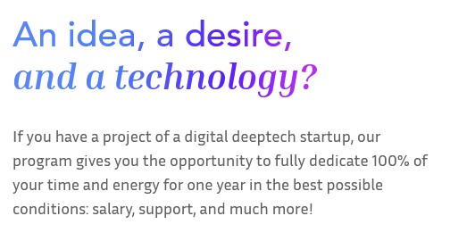 The message is clear from the moment you enter the site: “An idea, a desire, and a technology? If you have a project of a digital deeptech startup, our program gives you the opportunity to fully dedicate 100% of your time and energy for one year in the best possible conditions: salary, support, and much more!” To be eligible, you must be the leader of a digital deeptech startup project and be available to dedicate yourself 100% to it. So let’s go a little further!