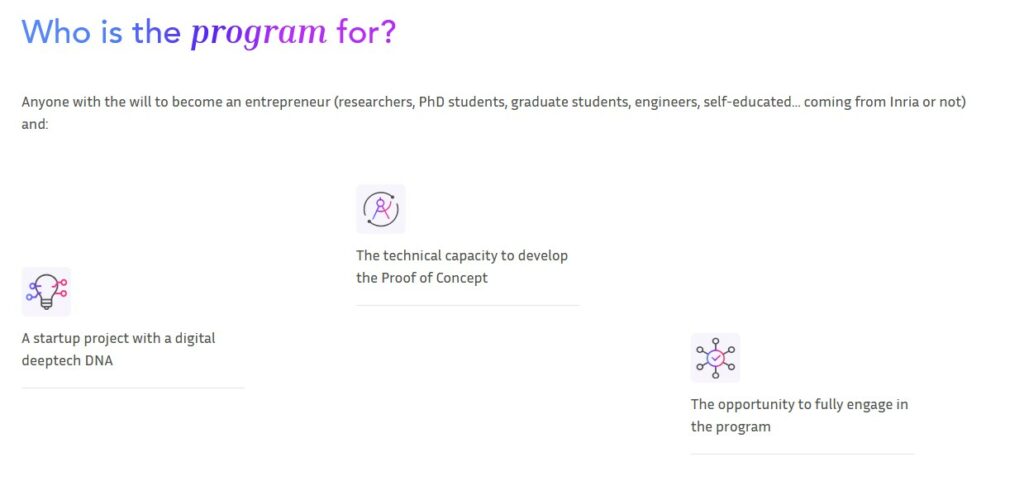 Anyone with the will to become an entrepreneur (researchers, PhD students, graduate students, engineers, self-educated… coming from Inria or not) and: