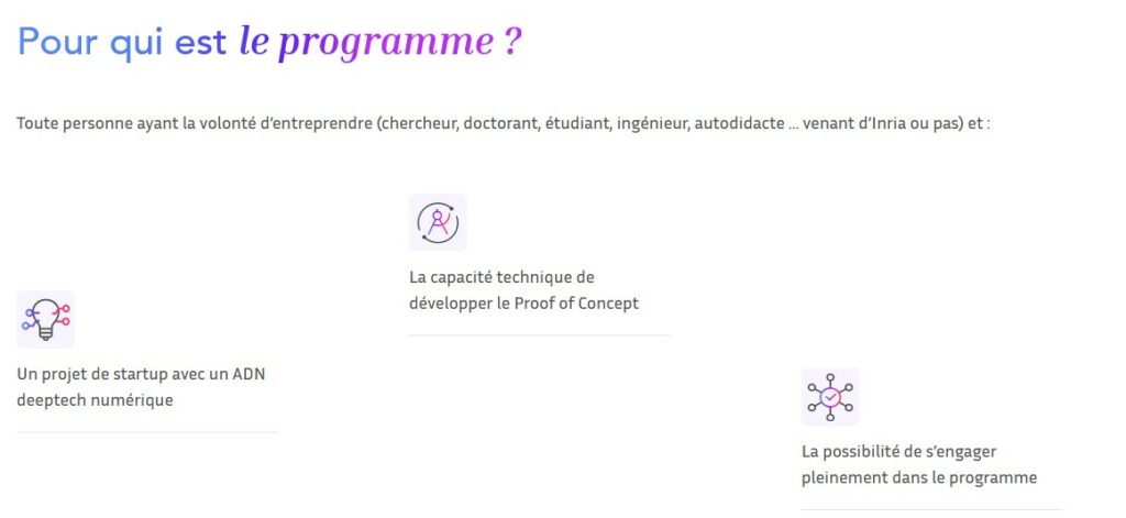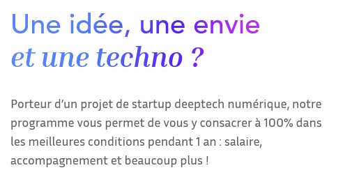 Le message est clair dès l’entrée sur le site : « Une idée, une envie et une techno ? Porteur.se d’un projet de startup deeptech numérique, notre programme vous permet de vous y consacrer à 100% dans les meilleures conditions pendant 1 an : salaire, accompagnement et beaucoup plus ! » Pour être éligible, il faut être porteur d’un projet de startup deeptech numérique et être disponible pour s’y consacrer à 100%. Allons donc un peu plus loin !